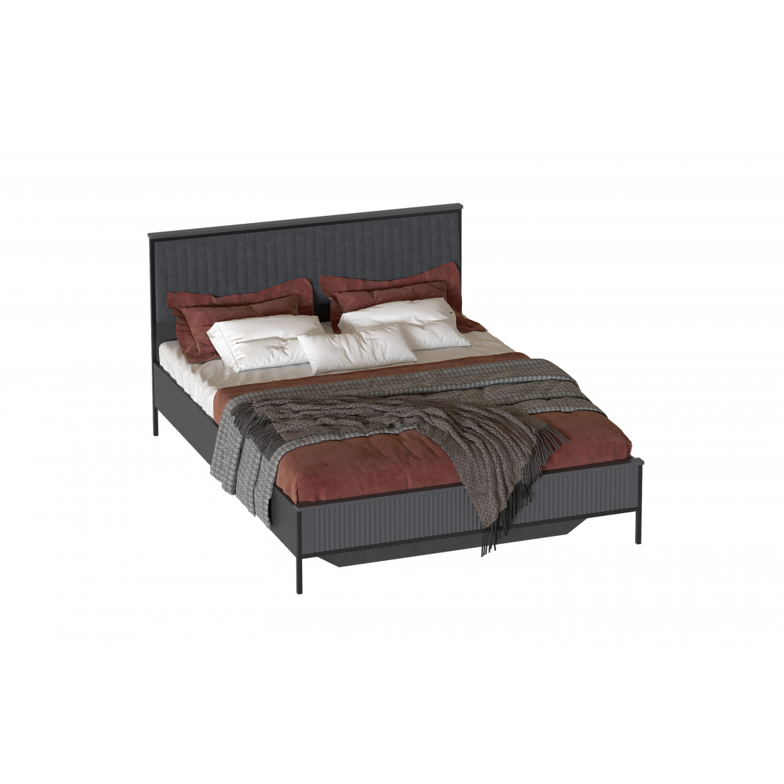 Дизайн коллекции гармонирует со стилем минимализм и лофт. Корпус изделий выполнен из качественного ЛДСП 16 мм цвета Металл Бруклин, фасады из МДФ 16 мм цвета Графит. Толщина металлических опор - 20 мм. Размеры спального места кровати: 160х200 см.